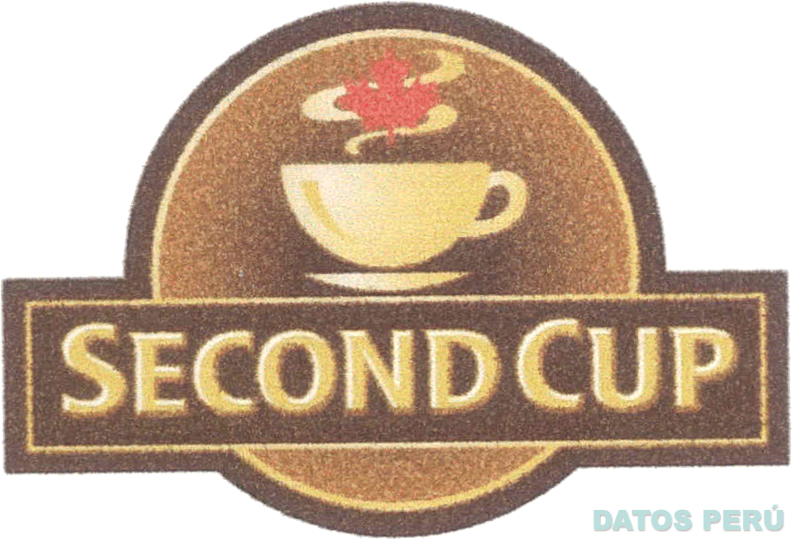 El logotipo conformado por la denominación SECOND CUP escrita en letras características, dentro de un rectángulo, en la parte superior se aprecia la figura estilizada de una taza humeando y una hoja de arce dentro de una figura circular, en los colores marrón en distintas tonalidades, rojo y amarillo; conforme al modelo adjunto
