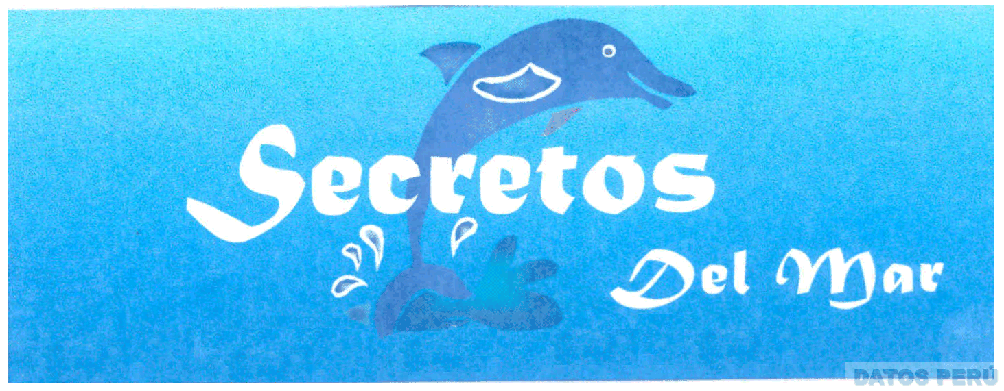El logotipo conformado por la denominación SECRETOS DEL MAR, escrita en letras características sobre la representación estilizada de un delfín, debajo del cual se aprecia una figura triangular, una figura irregular y la representación de unas gotas de agua, todo en los colores azul, blanco, negro, verde, gris, turquesa y celeste en diversas tonalidades; conforme al modelo adjunto