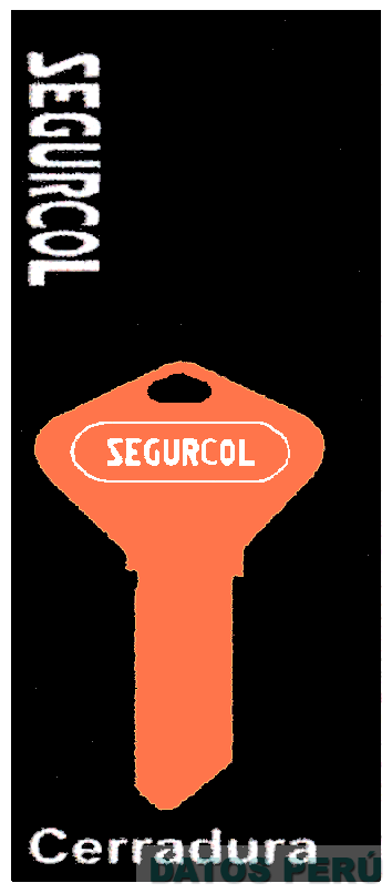 La denominación SEGURCOL escrita en letras características, la cual se aprecia en la parte superior izquierda y en la parte central, dentro de la representación estilizada de una llave encerrada en una circunferencia, en la parte inferior la palabra CERRADURA escrita en letras características, todo en los colores anaranjado, blanco y negro; conforme al modelo adjunto