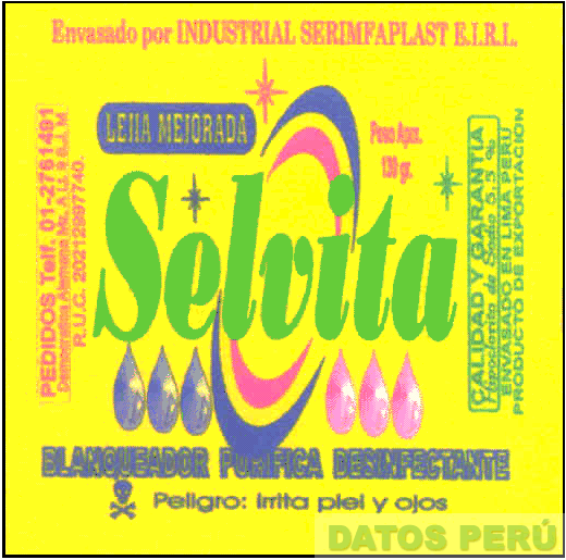 EL LOGOTIPO CONFORMADO POR LA DENOMINACION SELVITA ESCRITA EN LETRAS CARACTERISTICAS SOBREPUESTO A DOS SEMICIRCULOS, DEBAJO SE APRECIA LA REPRESENTACION DE SEIS GOTAS; EN LA PARTE INFERIOR SE OBSERVA LA FRASE BLANQUEADOR PURIFICA DESINFECTANTE; ALREDEDOR DE LA DENOMINACION LEYENDAS ALUSIVAS AL PRODUCTO, TODO EN LOS COLORES VERDE, VIOLETA, MAGENTA Y AMARILLO; CONFORME AL MODELO ADJUNTO