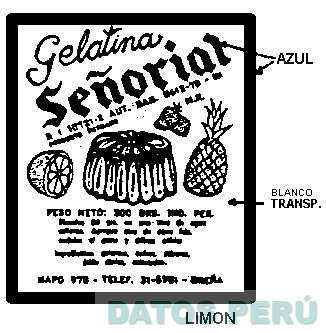 LA ETIQUETA RECTANGULAR CON LA DENOMINACION SEÑORIAL EN LETRAS GOTICAS DE COLOR AZUL SOBRE FONDO BLANCO, Y LAS FIGURAS DE UN LIMON PARTIDO, UNA PIÑA, DOS FRESAS Y UN MOLDE DE GELATINA, CONFORME AL MODELO ADJUNTO