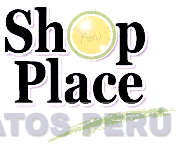 El logotipo conformado por la denominación SHOP PLACE escrita en letras características en donde la letra O está representada por una figura circular que contiene la denominación PERÚ escrita en letras características y al final se aprecia un trazo irregular, todo en los colores verde, amarillo, negro y blanco; conforme al modelo adjunto