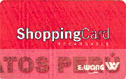 El logotipo conformado por la denominación SHOPPINGCARD escrita en letras características de color blanco y debajo la palabra RECARGABLE en menor tamaño, en la parte inferior se aprecia la denominación E.WONG W en forma característica en color blanco, todo sobre fondo rojo; conforme al modelo adjunto