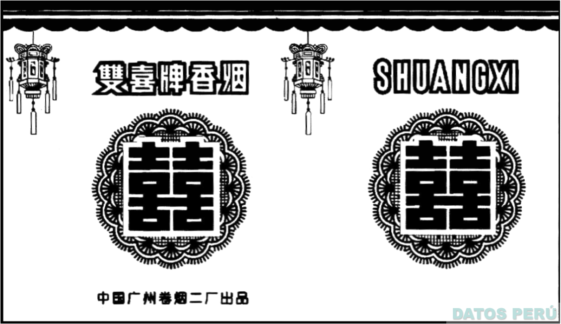 La etiqueta rectangular conteniendo el diseño estilizado de dos lámparas colgantes chinas; caracteres en letras chinas y la denominación SHUANGXI; en su parte central contiene el diseño de dos emblemas circulares, dentro de los cuales se han consignado caracteres en letras chinas; en su parte inferior caracteres en letras chinas en un menor tamaño y en la parte superior se observa un borde estilizado; conforme al modelo adjunto