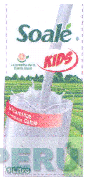 La etiqueta rectangular que contiene un paisaje como fondo sobre éste se aprecia la figura estilizada de un vaso con leche siendo llenado, el mismo que contiene una franja horizontal con frases alusivas al producto, en la parte superior se aprecia la denominación SOALE KIDS escrita en letras características donde la palabra KIDS se aprecia dentro de una figura ovalada incompleta, al lado izquierdo se aprecia una figura irregular debajo de la cual se aprecia la frase LA PROTEINA DE LA BUENA SALUD escrita en letras características, sin reivindicar, todo en los colores verde en distintas tonalidades, rojo en distintas tonalidades, gris en distintas tonalidades, blanco y anaranjado; conforme al modelo adjunto
