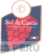 La denominación SOL DE CASCAS escrita en letras características de color blanco, de fondo se aprecia la silueta de un racimo de uvas en una hoja, todo en los colores rojo y negro; conforme al modelo adjunto