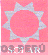 El logotipo conformado por la denominación SOLAR escrita en letras características, donde la letra O está representada por la figura estilizada de un sol, y en la parte superior la figura de un sol de mayor tamaño, todo en los colores blanco, rojo y plomo; conforme al modelo adjunto.