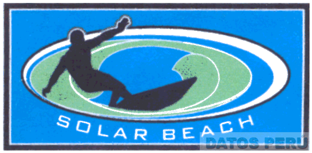 EL LOGOTIPO DE FORMA RECTANGULAR CONFORMADO POR LA REPRESENTACION DE UN SURFISTA DEBAJO LA DENOMINACION SOLAR BEACH ESCRITA EN LETRAS CARACTERISTICAS, TODO EN LOS COLORES NEGRO, BLANCO, VERDE Y AZUL; CONFORME AL MODELO ADJUNTO