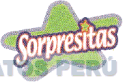 El logotipo conformado por la figura de una estrella estilizada en color verde con bordes plomos que contiene la denominación SORPRESITAS escrita en letras características en color blanco con bordes anaranjado y azul, en donde el punto de la letra I es una estrella; conforme al modelo adjunto