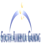 El logotipo conformado por la denominación SOUTH AMERICA GAMING escrita en letras características y en la parte superior la figura de una media luna y cuatro pequeños círculos; todo en color azul en diferentes tonalidades y amarillo; conforme al modelo adjunto