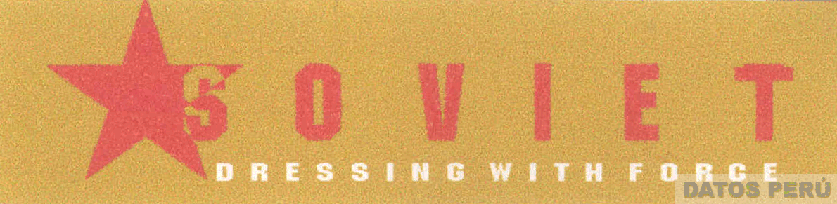 La denominación SOVIET escrita en letras características, al lado izquierdo el diseño estilizado de una estrella, en la parte inferior la frase DRESSING WITH FORCE escrita en letras características; todo en los colores rojo, dorado y blanco; conforme al modelo adjunto