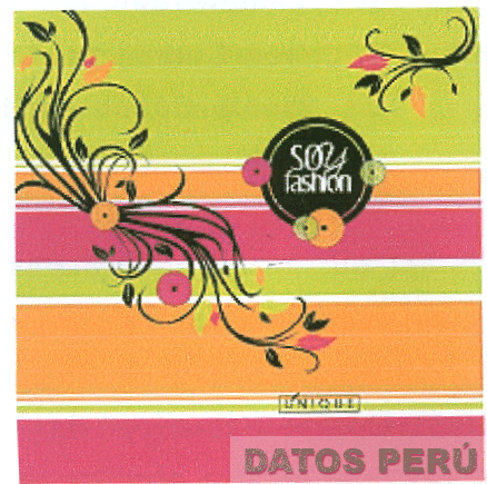 el logotipo cuadrangular que contiene la denominación SOY FASHION escrita en letras características dentro de una figura circular en cuyo alrededor se aprecian otras figuras circulares, en la parte inferior aparece, dentro de una figura rectangular, la denominación UNIQUE escrita en letras características, sobresaliendo de la letra U una figura irregular, y en los extremos del logotipo se aprecian unas figuras irregulares semejantes a ramas de plantas, todo en la combinación de colores verde, fucsia, anaranjado, blanco, gris y negro; conforme al modelo adjunto