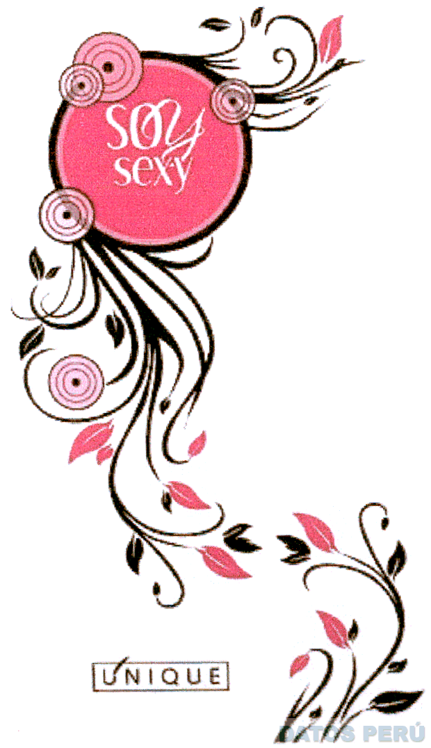 El logotipo conformado por una figura circular central superpuesta por cuatro círculos de menor tamaño, conteniendo el círculo central la denominación SOY SEXY escrita en forma y letras estilizadas, del cual se desprende una sucesión de líneas de trazo irregular y en sentido diverso que se asemejan a ramas de plantas, en cuyos extremos se inserta el diseño estilizado de un círculo y de varias hojas, debajo de todo lo cual se consigna la denominación UNIQUE escrita en letras características y encerrada dentro de un recuadro del que sobresale la letra U, todo en la combinación de colores rosado en diversas tonalidades, negro y blanco; conforme al modelo adjunto