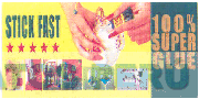 El logotipo conformado por la denominación STICK FAST escrita en letras características; al lado derecho se aprecia la figura de dos manos sosteniendo una taza y un tubo de pegamento que contiene la frase SUPER GLUE escrita en letras características; en la parte inferior se observa la figura de cinco estrellas y debajo de éstas cinco figuras características sin reivindicar; al lado derecho se aprecia la frase 100% SUPER GLUE; en la combinación de colores amarillo, rojo, verde y amarillo; conforme al modelo adjunto