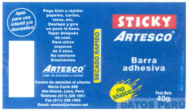 LA ETIQUETA CON LA DENOMINACION STICKY ESCRITA EN LETRAS CARACTERISTICAS DENTRO DE UN RECTANGULO, DEBAJO LA DENOMINACION ARTESCO Y EN LA PARTE INFERIOR LA FIGURA DE UNA MANCHA, TODO EN COLORES AZUL, BLANCO, AMARILLO Y ROJO; CONFORME AL MODELO ADJUNTO