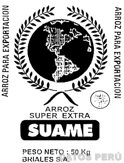 EL LOGOTIPO CONFORMADO POR LA DENOMINACION SUAME ESCRITA EN LETRAS CARACTERISTICAS, DENTRO DE UNA FIGURA IRREGULAR; ENCIMA DE ESTA UNA FIGURA CIRCULAR CONTENIENDO EL MAPA DE AMERICA DEL NORTE Y SUR, RODEADO POR DOS ESPIGAS CARACTERISTICAS; A LOS COSTADOS LA FRASE ARROZ PARA EXPORTACION Y DEMAS FRASES ALUSIVAS AL PRODUCTO; CONFORME AL MODELO ADJUNTO,