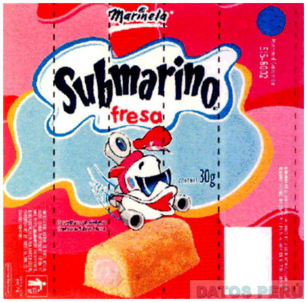 LA ETIQUETA CONFORMADA POR LA DENOMINACION SUBMARINO FRESA ESCRITA EN LETRAS CARACTERISTICAS, LA DENOMINACION MARINELA ESCRITA EN LETRAS CARACTERISTICAS, LA FIGURA CARICATURIZADA DE UN SUBMARINO CON GORRO Y LENTES Y FIGURA DE UN BIZCOCHO Y DEMAS LEYENDAS ALUSIVAS AL PRODUCTO; TODO EN LOS COLORES BLANCO, NEGRO, CELESTE, TURQUESA, AMARILLO, ROSADO, ANARANJADO Y FUCSIA; CONFORME AL MODELO ADJUNTO
