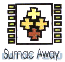 La denominación SUMAC AWAY escrita en letras características y en la parte superior la figura de cuatro cruces dentro de un cuadrado y a los costados derecho e izquierdo diversos rectángulos pequeños, todo en la combinación de colores blanco, verde, amarillo, marrón y negro; conforme al modelo adjunto