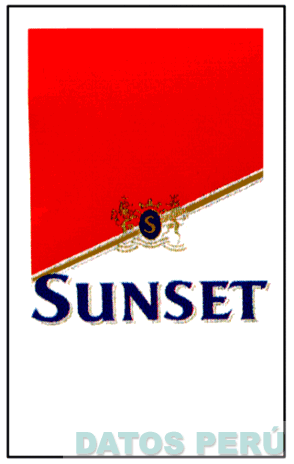LA DENOMINACION SUNSET, EN LETRAS CARACTERISTICAS DENTRO DE UNA ETIQUETA RECTANGULAR QUE PRESENTA UNA FRANJA OBLICUA EN CUYO CENTRO SE APRECIA EL DISEÑO DE UN ESCUDO CON TENANTES, TODO EN LOS COLORES ROJO, AZUL, DORADO, BLANCO Y NEGRO, CONFORME AL MODELO