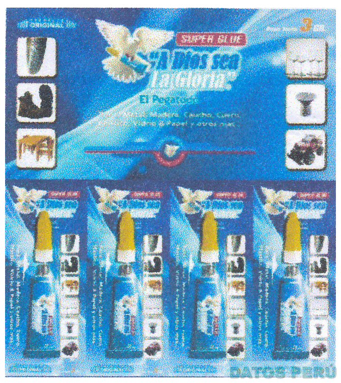 La denominación SUPER GLUE "A DIOS SEA LA GLORIA" EL PEGATODO y logotipo (se reivindica colores), conforme al modelo