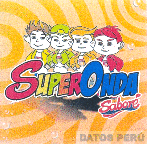 La etiqueta conformada por la figura estilizada de cuatro personajes y la denominación SUPERONDA SABORE escrita en letras características sobre un fondo de figuras irregulares, todo en la combinación de colores amarillo, marrón, verde, anaranjado, rojo, blanco y azul; conforme al modelo adjunto