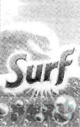 La denominación SURF escrita en letras características, dentro de una etiqueta rectangular que presenta como fondo el diseño formado por la cresta de una ola, burbujas y destellos; conforme al modelo adjunto