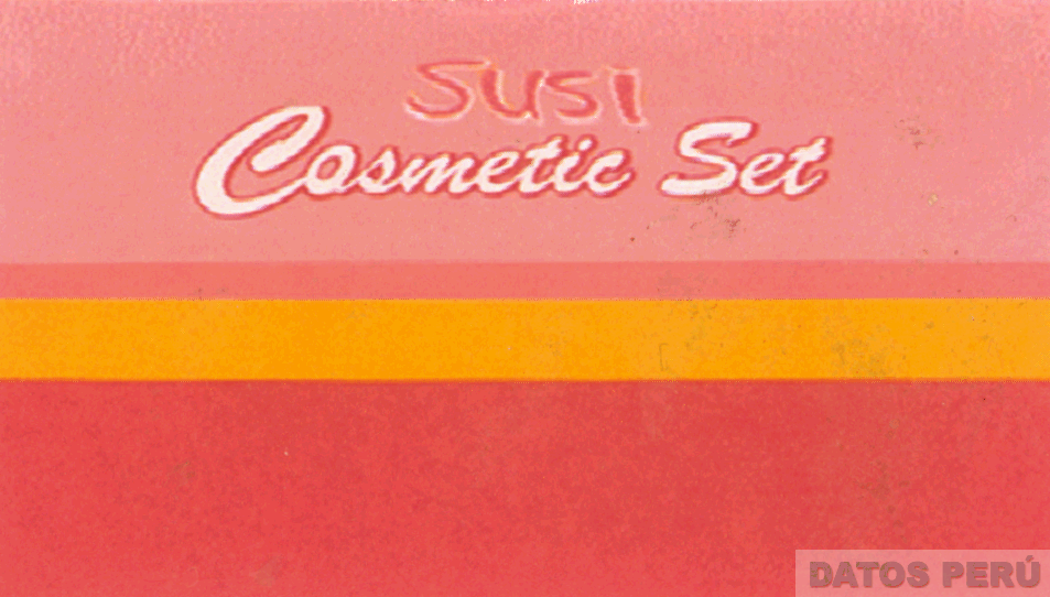 La denominación SUSI COSMETIC SET (sin reivindicar COSMETIC SET) escrita en letras características, sobre cuatro franjas, todo en la combinación de colores blanco, anaranjado, fucsia y rosado; conforme al modelo adjunto