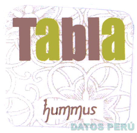La etiqueta cuadrangular, con las denominaciones TABLA HUMMUS escrita en letras características, con diversas figuras irregulares en el fondo, en los colores marrón, verde y blanco; conforme al modelo adjunto