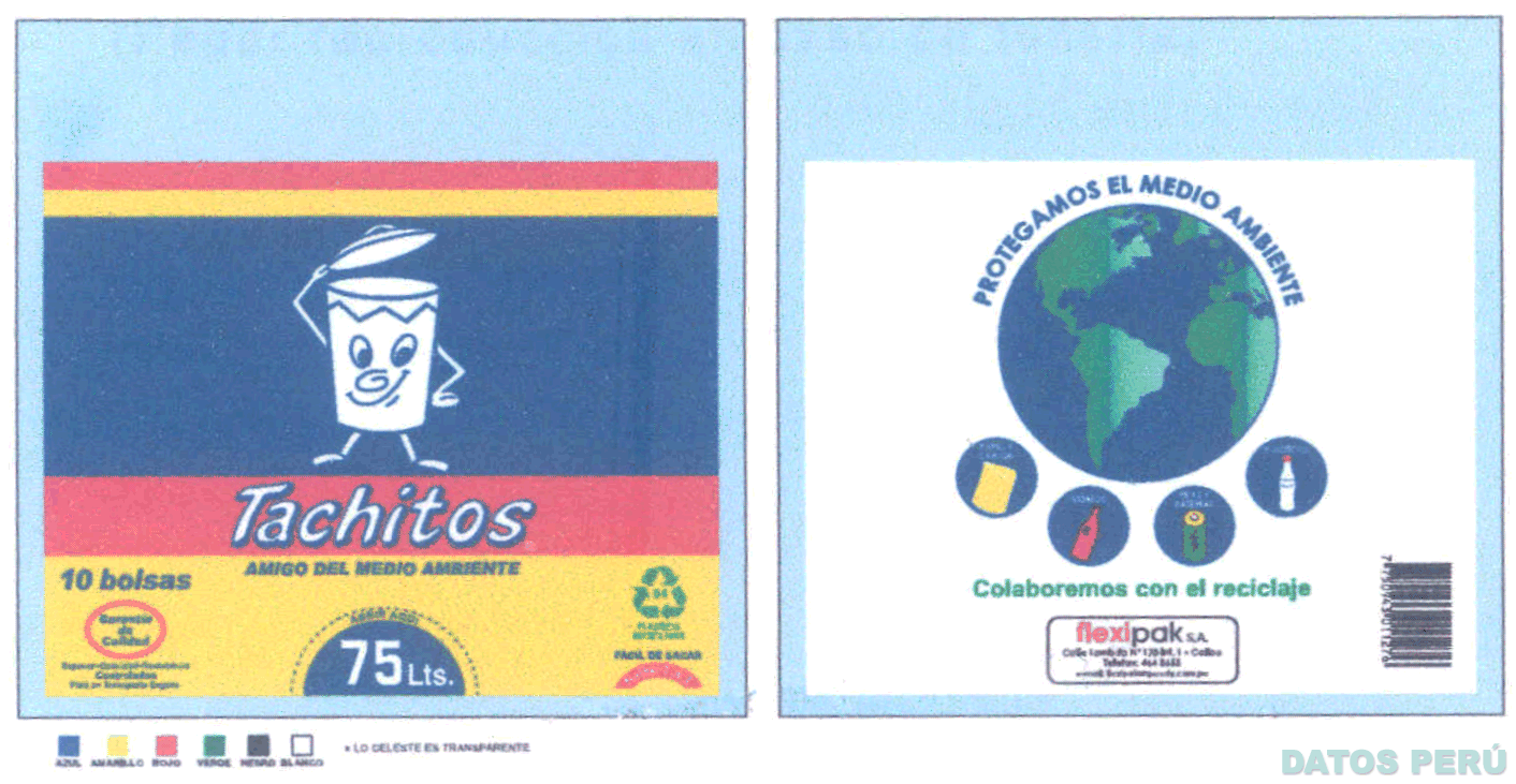 La figura bidimensional conformada por la denominación TACHITOS escrita en letras características y la figura caricaturesca de un tacho, en la parte inferior central la figura estilizada de un semicírculo, todo sobre un fondo de figuras rectangulares de diferentes tamaños y frases alusivas al producto sin reivindicar; en la parte posterior la figura estilizada del planeta tierra que en su parte inferior presenta la figura estilizada de cuatro figuras circulares que en su interior presentan figuras irregulares, todo en la combinación de colores rojo, azul, amarillo y blanco; conforme al modelo adjunto