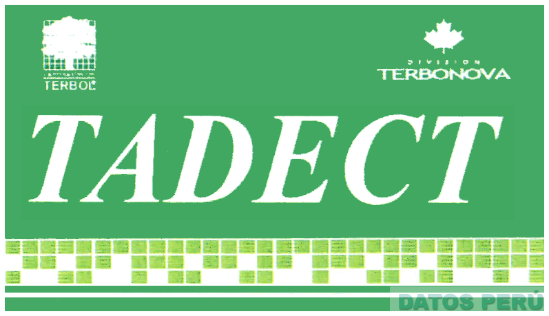 El logotipo rectangular de fondo verde oscuro con una franja color verde claro, en cuyo interior se aprecia la denominación TADECT y sobre ella, la figura de un árbol debajo del cual se aprecia la denominación LABORATORIOS TERBOL y al otro extremo se aprecia la figura de una triple hoja de trébol, debajo de la cual se aprecia la denominación DIVISION TERBONOVA; conforme al modelo adjunto