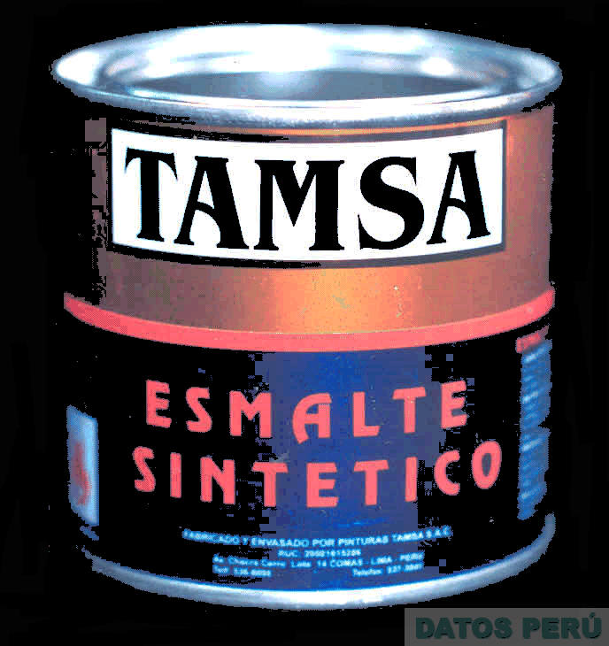 La figura bidimensional de una lata en cuya parte superior se aprecia una figura rectangular conteniendo la denominación TAMSA escrita en letras características, en la parte inferior se observa una figura rectangular conteniendo la frase ESMALTE SINTETICO escrita en letras características, todo en los colores plateado, dorado, blanco, negro, anaranjado y azul; conforme al modelo adjunto