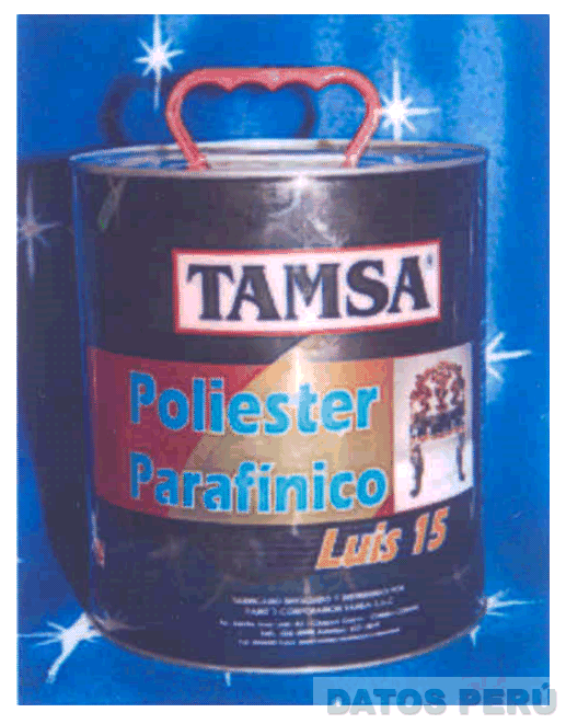 El logotipo conformado por la denominación TAMSA escrita en letras características, dentro de una figura rectangular, debajo la denominación POLIESTER PARAFÍNICO escrita en letras características, al lado derecho se aprecia la figura estilizada de una silla, dentro de una figura rectangular, debajo la denominación LUIS 15 escrita en letras características, con frases alusivas al producto, todo dentro de la figura de una galonera rodeada de estrellas, en la combinación de colores marrón, rojo, negro, dorado, blanco, gris, azul, celeste y anaranjado; conforme al modelo adjunto