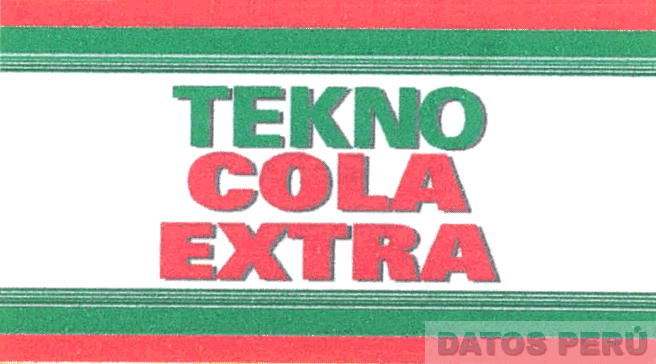 La etiqueta rectangular horizontal conformada por franjas paralelas de diversos tamaños, consignándose en la franja central la denominación TEKNO COLA EXTRA escrita en letras características, en los colores verde, blanco, rojo y gris; conforme al modelo adjunto