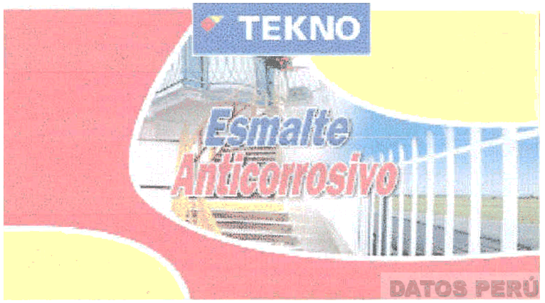 La etiqueta rectangular dividida en cuatro partes de tamaño y forma diversa por unas líneas de forma irregular, consignándose en su parte superior central un rectángulo conteniendo la denominación TEKNO escrita en letras características y el diseño estilizado de un diamante, configurado por la conjunción de un rectángulo, un cuadrado y un triángulo; en su parte central se consigna la denominación ESMALTE ANTICORROSIVO escrita en letras características sobreponiéndose al diseño de una escalera, rejas, baranda de balcón y objetos diversos, en los colores amarillo, rojo, blanco, azul, celeste, negro, gris, verde; conforme al modelo adjunto