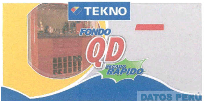 La etiqueta rectangular dividida por líneas de forma irregular en cuatro partes, en la parte superior se aprecia una figura rectangular conteniendo la denominación TEKNO escrita en letras características precedida por la figura estilizada de un diamante, debajo de la misma se aprecia, dentro de una figura semi circular, la figura estilizada de un mueble de bar de madera con mostrador y pared como fondo, en el mismo se aprecian botellas, una jarra, copas y una hielera, al lado derecho se aprecia una figura geométrica rectangular romboide, en la parte central se aprecia la frase FONDO QD SECADO RAPIDO escrita en letras características donde la frase SECADO RAPIDO se aprecia dentro de una figura irregular, todo en los colores azul, amarillo, negro, blanco, verde, gris, marrón en distintas tonalidades, dorado y rojo; conforme al modelo adjunto