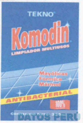 La etiqueta de fondo color azul, celeste, blanco, gris, amarillo y azul marino, en cuya parte superior central se observa la denominación TEKNO escrita en letras características de color blanco; debajo de la cual se aprecia la denominación KOMODIN escrita en letras características de color rojo cuya letra N contiene en la parte superior derecha un destello de luz, consignándose debajo de la misma la frase LIMPIADOR MULTIUSOS escrita en letras características de color blanco con bordes color rojo; debajo se aprecian unas mayólicas de color blanco y gris sobre las cuales se observan las palabras MAYOLICAS, FORMICA y MARMOL escrita en letras características de color rojo y la parte inferior esta compuesta por una franja de color amarillo en la que se aprecia la palabra ANTIBACTERIAL escrita en letras características en color rojo; debajo de la cual se aprecia una franja de color azul al lado derecho de la cual se consigna en letras y números característicos de color blanco la frase 100% PERUANO debajo de la cual se observa la frase CONTENIDO NETO 330 ml. escrita en letras características; conforme al modelo adjunto