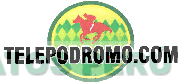 La denominación TELEPODROMO.COM escrita en letras características de color negro sobrepuesta a una figura circular en cuyo interior se aprecia un caballo con jinete de color rojo sobre un fondo conformado por figuras romboides en diversas tonalidades de verde y amarillo; conforme al modelo adjunto