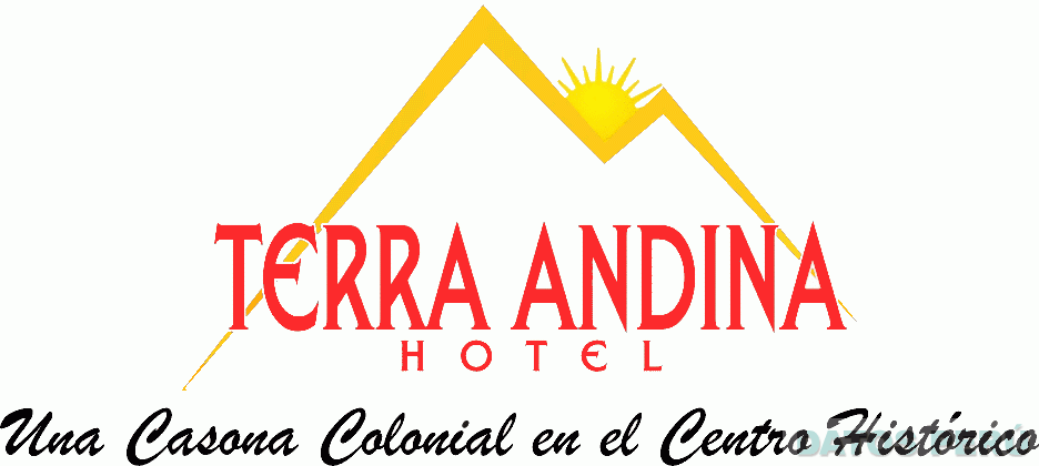 El logotipo conformado por la denominación TERRA ANDINA HOTEL escrita en letras características, acompañada por la representación estilizada de dos cerros y un sol, debajo la frase UNA CASONA COLONIAL EN EL CENTRO HISTÓRICO escrita en letras características, todo en los colores rojo, anaranjado, amarillo y negro; conforme al modelo adjunto