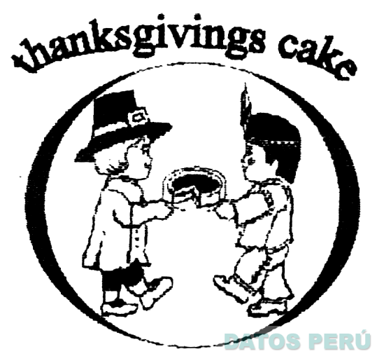 EL LOGOTIPO CONFORMADO POR LA FIGURA DE DOS NIÑOS UNO CON UN SOMBRERO Y EL OTRO CON UNA PLUMA, EN UN GESTO DE INTERCAMBIO, EN LA PARTE SUPERIOR LA DENOMINACION THANKSGIVINGS CAKE ESCRITA EN LETRAS CARACTERISTICAS; CONFORME AL MODELO ADJUNTO