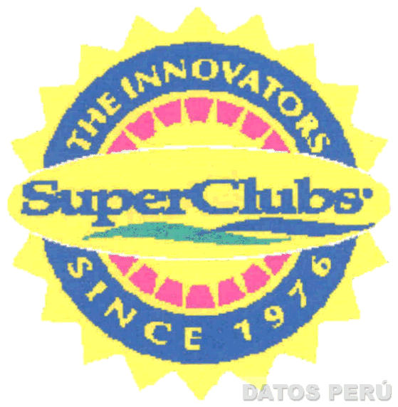 Una figura circular con bordes dentados que contiene la denominación THE INNOVATORS SUPERCLUBS SINCE 1976 (sin reivindicar la denominación SUPERCLUBS) escrita en letras características donde se aprecia una figura ovoide, figuras trapezoidales y dos figuras irregulares, todo en los colores amarillo, azul, azul aguamarina y magenta; conforme al modelo adjunto