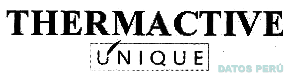 El logotipo conformado por la denominación THERMACTIVE escrita en letras características y debajo la denominación UNIQUE escrita en letras características, sobresaliendo del extremo superior derecho de la letra U una línea irregular; todo dentro de una figura rectangular; conforme al modelo adjunto