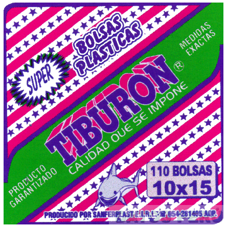 LA ETIQUETA CONFORMADA POR LA DENOMINACION TIBURON, ESCRITA SOBRE UNA FRANJA EN DIAGONAL; CON FONDO DE LINEAS Y ESTRELLAS, TAMBIEN EN DIAGONAL; EN LA PARTE INFERIOR LA FIGURA ESTILIZADA DE UN TIBURON; Y DEMAS TEXTOS ALUSIVOS AL PRODUCTO; TODO EN LOS COLORES MORADO, VERDE, ROJO Y BLANCO; CONFORME AL MODELO ADJUNTO,