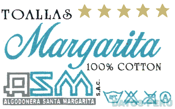 La denominación TOALLAS MARGARITA 100% COTTON escrita en letras características, la representación estilizada de cinco estrellas, en la parte inferior se observa la frase ASM ALGODONERA SANTA MARGARITA escrita en letras características y demás leyendas alusivas al producto, en los colores turquesa, gris y dorado; conforme al modelo adjunto