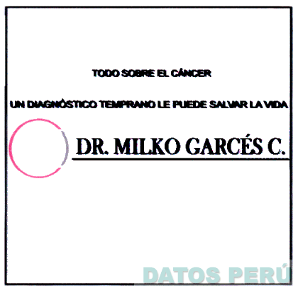 La denominación TODO SOBRE EL CANCER UN DIAGNOSTICO TEMPRANO LE PUEDE SALVAR LA VIDA DR MILKO GARCÉS C. y logotipo (se reivindica colores), conforme al modelo