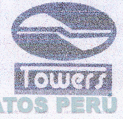 La denominación TOWERS escrita en letras características, encerrada en una figura rectangular, sobre la cual se aprecia un óvalo que contiene un diseño irregular, todo en los colores blanco, negro, azul; conforme al modelo adjunto