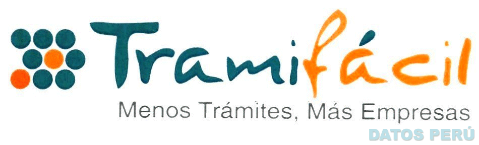 El logotipo conformado por la denominación TRAMIFÁCIL MENOS TRÁMITES, MÁS EMPRESAS escrita en letras características y a su lado derecho se aprecia la representación de nueve figuras circulares, en la combinación de colores azul (cian=99, magenta=71, amarillo=36, negro=22), anaranjado (cian=5, magenta=76, amarillo=100, negro=0) y rojo (cian=17, magenta=98, amarillo=100, negro=7); conforme al modelo adjunto