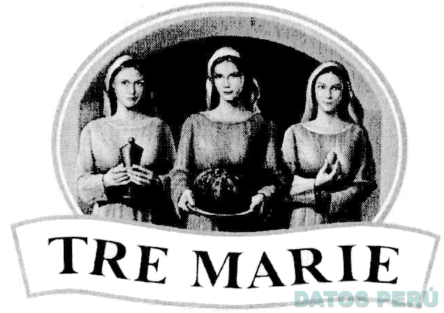 El logotipo conformado por la denominación TRE MARIE escrita en letras características y dentro de un rectángulo en forma irregular; en la parte superior se aprecia la figura de tres mujeres sosteniendo la representación estilizada de una jarra, un pastel y un huevo, todo dentro de una figura oval de doble borde; sin reivindicar colores; conforme al modelo adjunto