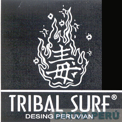 LA ETIQUETA CUADRANGULAR FORMADA POR LA DENOMINACION TRIBAL SURF ESCRITA EN LETRAS CARACTERISTICAS, ENCIMA DE ESTA, UN MONOGRAMA CHINO DENTRO DE UNA LLAMA DE FUEGO ESTILIZADA; CONFORME AL MODELO ADJUNTO