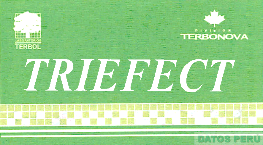 La denominación TRIEFECT escrita en letras características sobre fondo verde oscuro y en la parte inferior una franja de color verde claro; en la parte superior izquierda se aprecia la figura de un árbol y la denominación LABORATORIOS TERBOL escrita en letras características, y en la parte superior derecha la figura de una triple hoja de trébol y la denominación DIVISION TERBONOVA; conforme al modelo adjunto