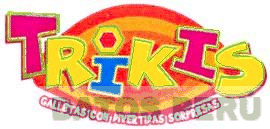 El logotipo conformado por la denominación TRIKIS escrita en letras características de colores fucsia, amarillo y celeste con bordes de color verde; estando sobre la primera letra I la figura de un hexágono de colores fucsia, amarillo y verde; debajo aparece la frase GALLETAS CON DIVERTIDAS SORPRESAS escrita en letras características de color blanco y bordes rojos; todo sobre una figura irregular de color anaranjado en distintas tonalidades; conforme al modelo adjunto
